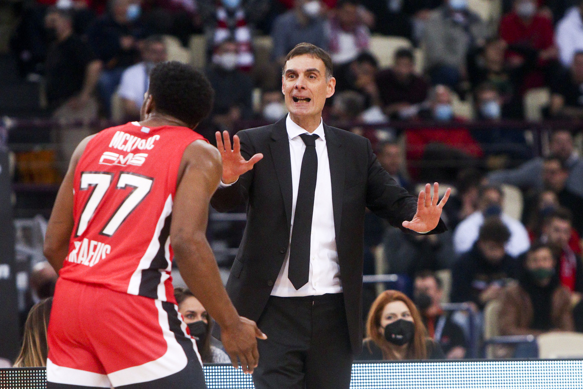 Ο προπονητής του Ολυμπιακού Γιώργος Μπαρτζώκας αντιδρά, κατά τη διάρκεια του αγώνα μπάσκετ Ολυμπιακός - Αρμάνι Μιλάνο για την 27η αγωνιστική της Euroleague, στο Στάδιο Ειρήνης & Φιλίας στο Νέο Φάληρο, Πέμπτη 24 Φεβρουαρίου 2022. ΑΠΕ-ΜΠΕ/ΑΠΕ-ΜΠΕ/ΓΕΩΡΓΙΑ ΠΑΝΑΓΟΠΟΥΛΟΥ