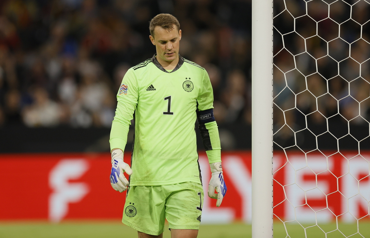 epa10001112 Germany's goalkeeper Manuel Neuer reacts after conceding England's 1-1 equalizer during the UEFA Nations League soccer match between Germany and England in Munich, Germany, 07 June 2022. EPA/Ronald Wittek