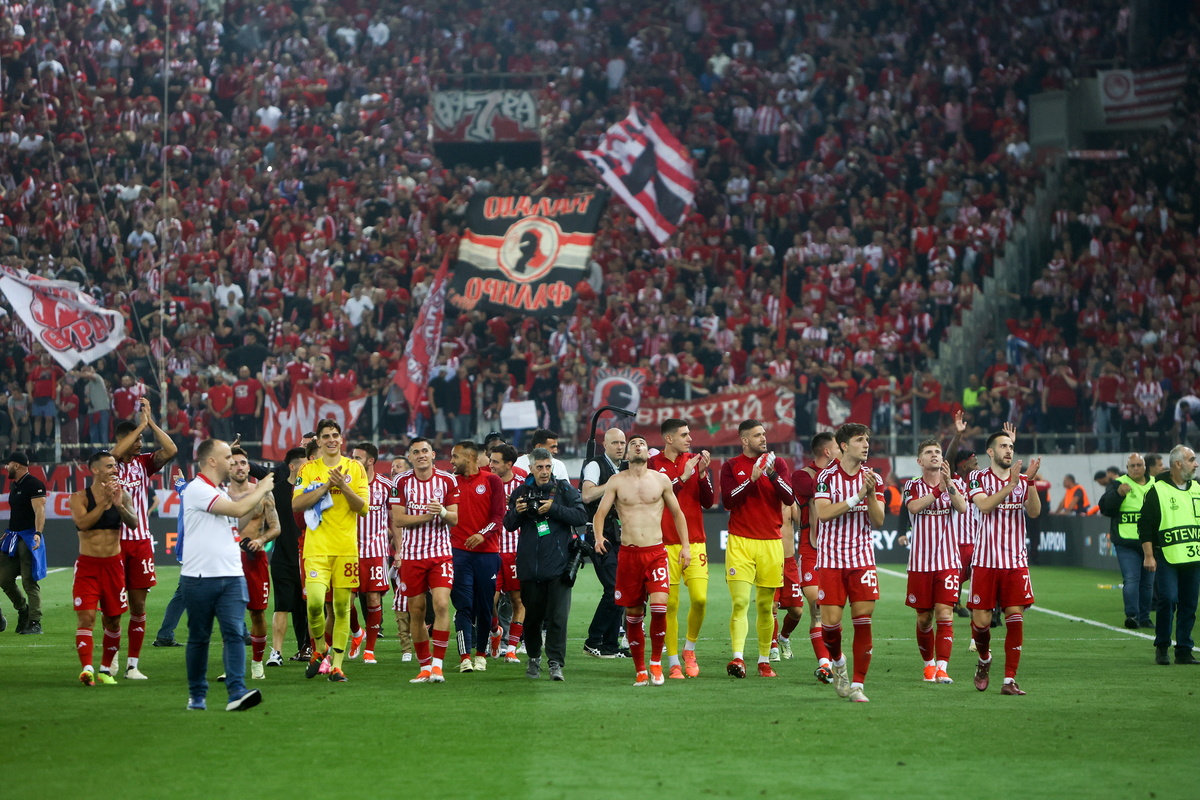 epa11330245 Players of Olympiacos celebrate winning the the UEFA Europa Conference League semi final, second leg soccer match between Olympiacos Piraeus and Aston Villa, in Piraeus, Greece, 09 May 2024. EPA/Georgia Panagopoulou