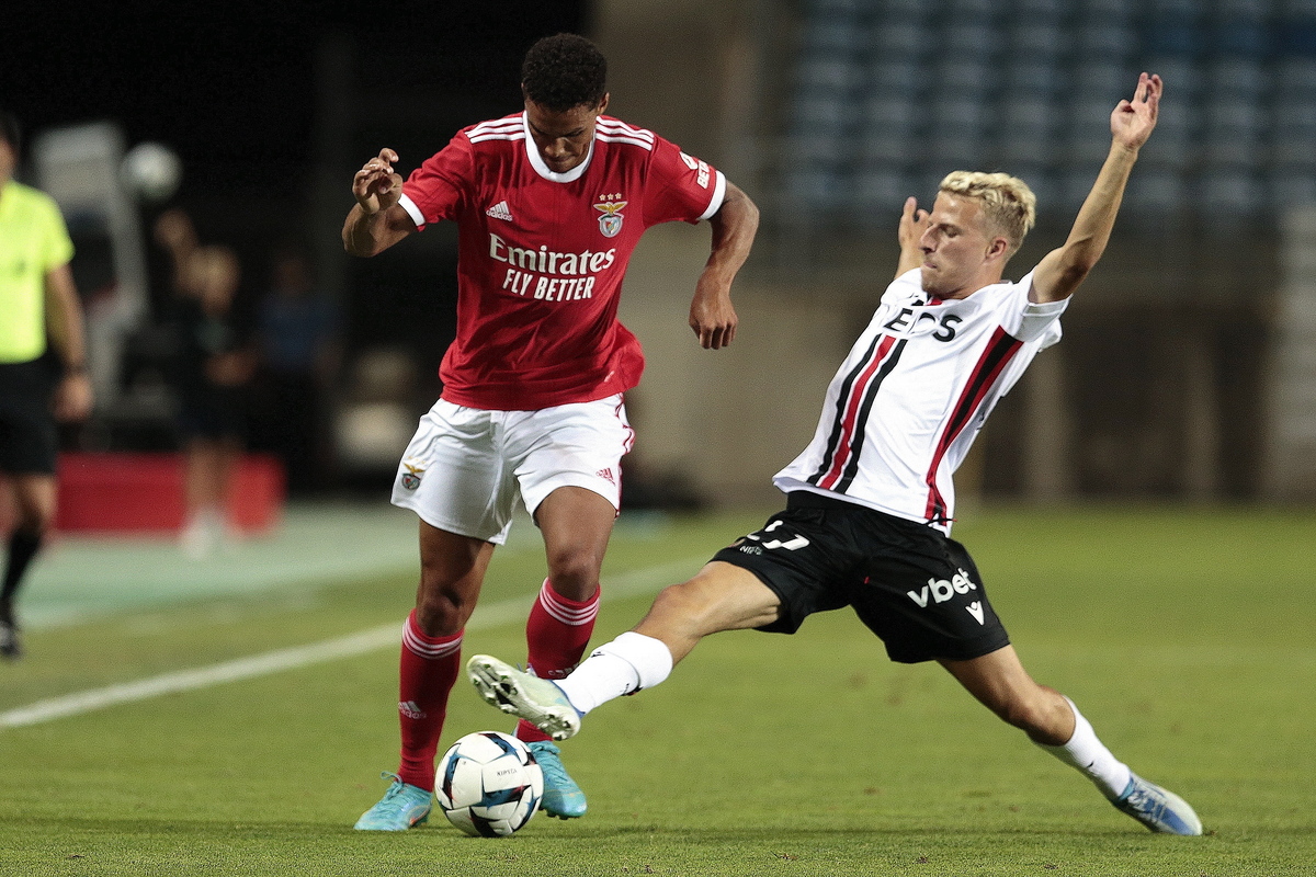 epa10073589 Benfica player Bah (L) in action against Nice`s Alexis Trouillet during their Algarve Tournament soccer match held at Algarve Stadium, Faro, Portugal, 15 July 2022. EPA/DUARTE DRAGO