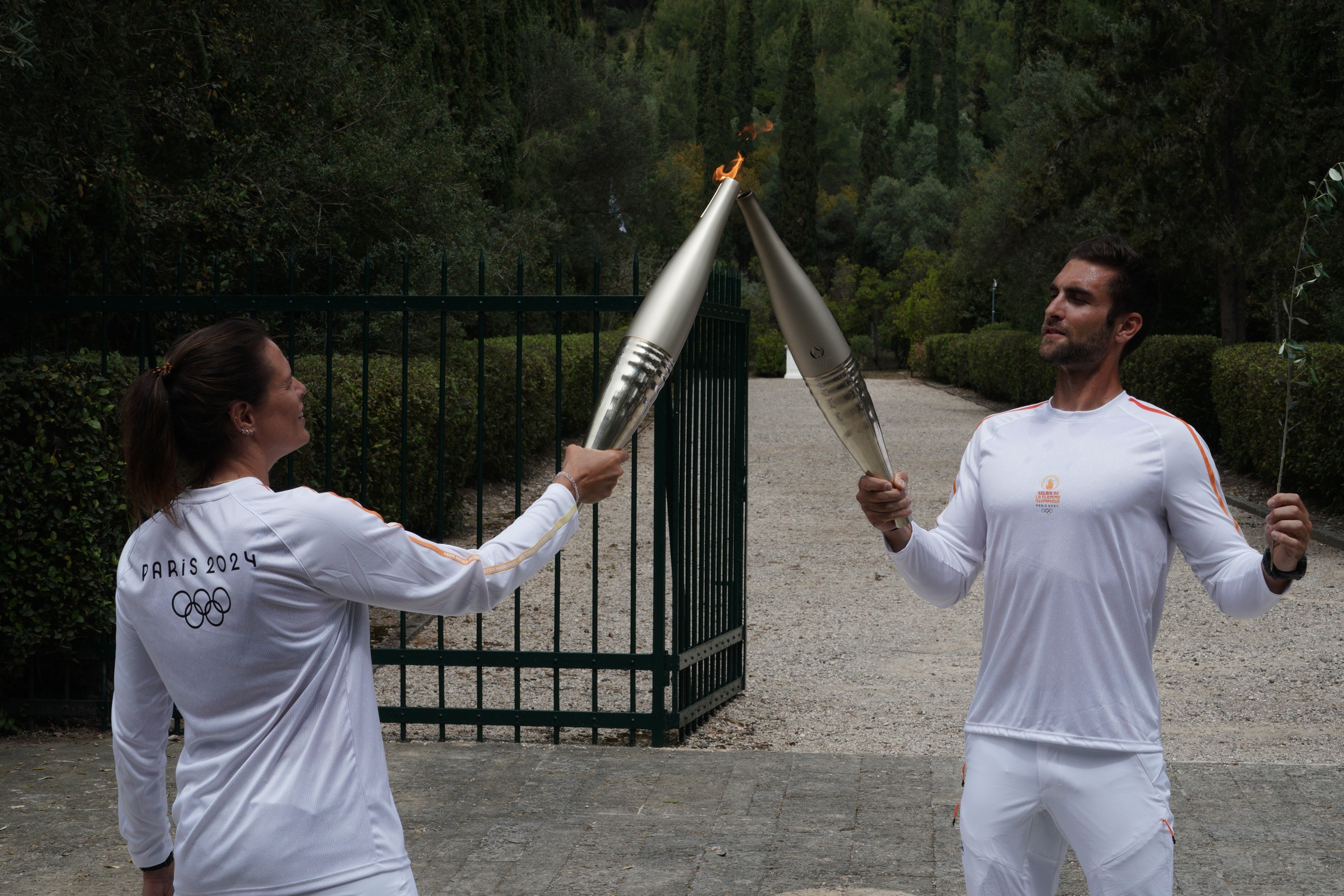 First torchbearer, 2020 Olympic gold rower Stefanos Douskos hands over the flame for the Paris 2024 Olympic Games to French swimmer Laure Manaudou who won her first Olympic title in the 400m freestyle at the 2004 Athens Olympics. in Olympia, on April 16, 2024. / Πρώτος λαμπαδηδρόμος, κωπηλάτης χρυσός Ολυμπιονίκης το 2020, Στέφανος Ντούσκος παραδίδει την φλόγα για τους Ολυμπιακούς Αγώνες του Παρισιού 2024, στην Γαλλίδα κολυμβήτρια, Λορ Μανοντού, η οποία κατέκτησε τον πρώτο Ολυμπιακό τίτλο της στα 400 μέτρα ελεύθερο, στους Ολυμπιακούς Αγώνες της Αθήνας το 2004, στην Ολυμπία, στις 16 Απριλίου 2024.