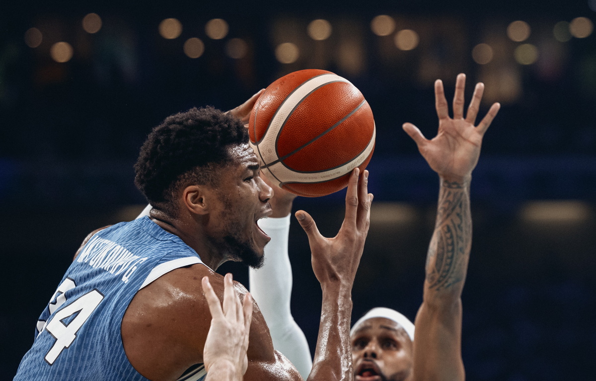 epa11518669 Giannis Antetokounmpo of Greece in action during the Men's Group A match between Australia and Greece in the Paris 2024 Olympic Games, at the Pierre Mauroy Stadium in Villeneuve-d'Ascq, France, 02 August 2024. EPA/ALEX PLAVEVSKI