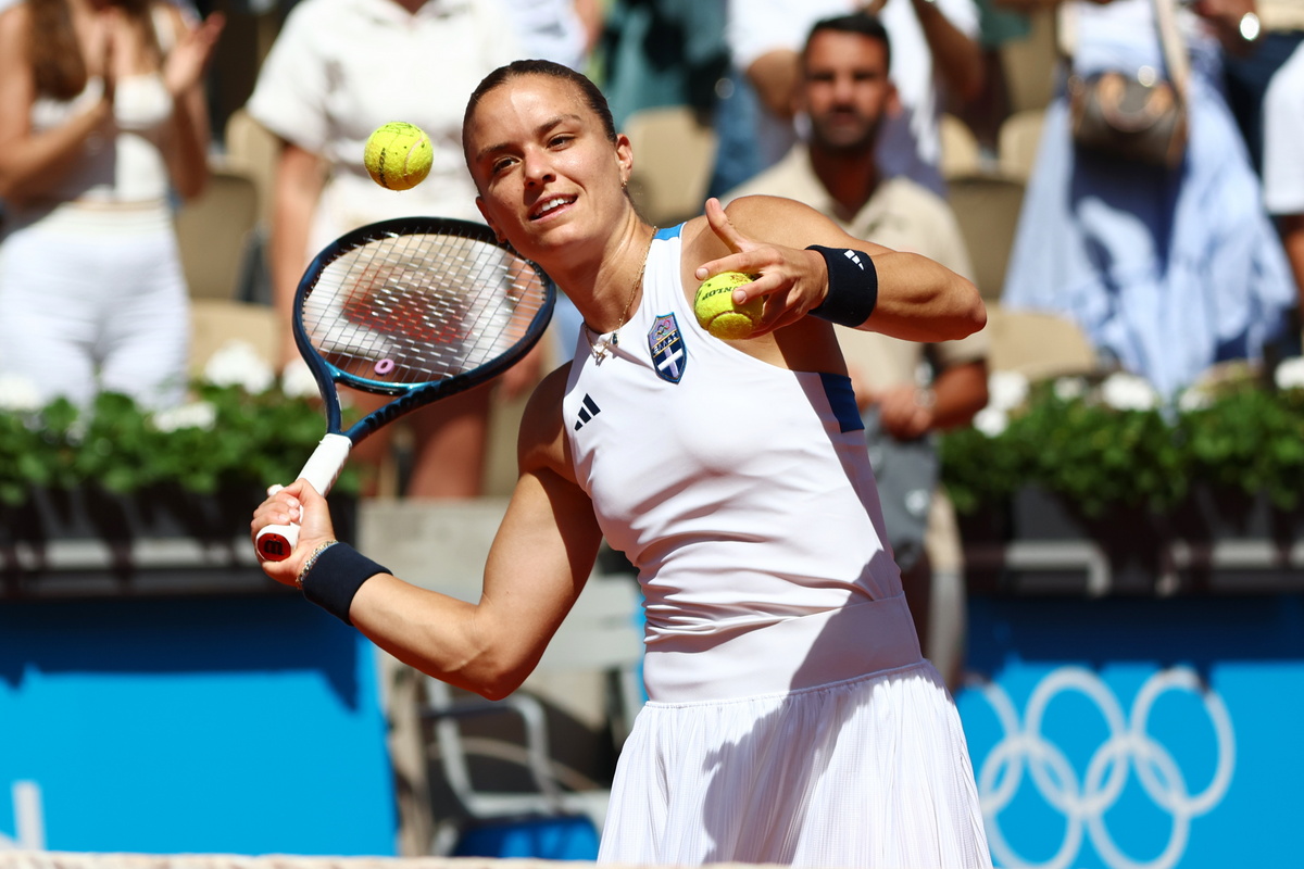 epa11502028 Maria Sakkari of Greece shoots signed tennis ball into the crowd after her win against Danka Kovinic of Montenegro in their Women's Singles first round match at the Tennis competitions in the Paris 2024 Olympic Games, at the Roland Garros in Paris, France, 28 July 2024. EPA/DIVYAKANT SOLANKI