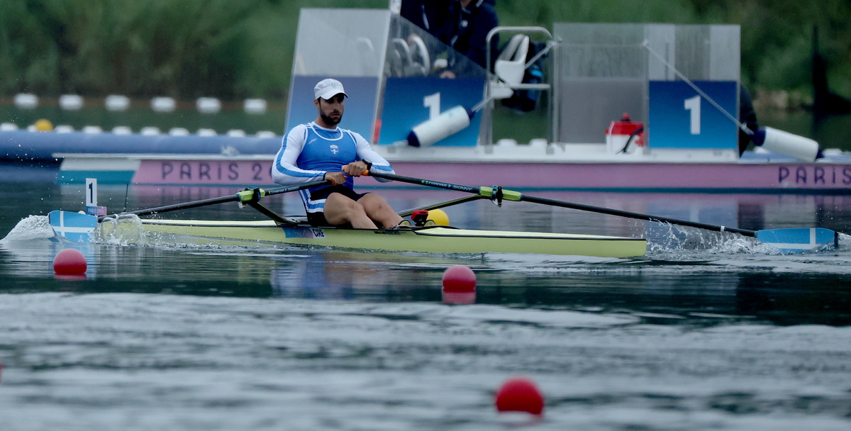 epa11498553 Stefanos Ntouskos of Greece competes in the Men Singles Sculls heats of the Rowing competitions in the Paris 2024 Olympic Games, at the Vaires-sur-Marne Nautical Stadium in Vaires-sur-Marne, France, 27 July 2024. EPA/MAXIM SHIPENKOV