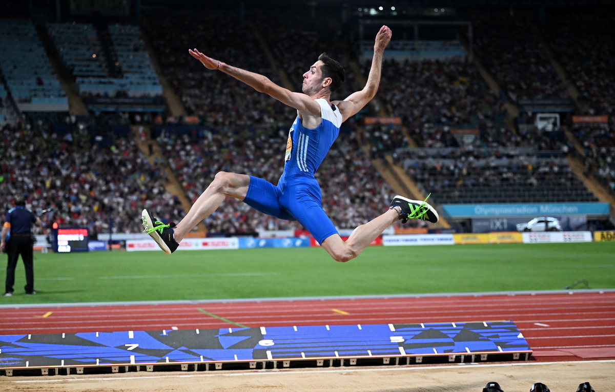 epa10124962 Miltiadis Tentoglou of Greece competes in the men's Long Jump final during the Athletics events at the European Championships Munich 2022, Munich, Germany, 16 August 2022. The championships will feature nine Olympic sports, Athletics, Beach Volleyball, Canoe Sprint, Cycling, Artistic Gymnastics, Rowing, Sport Climbing, Table Tennis and Triathlon. EPA/FILIP SINGER