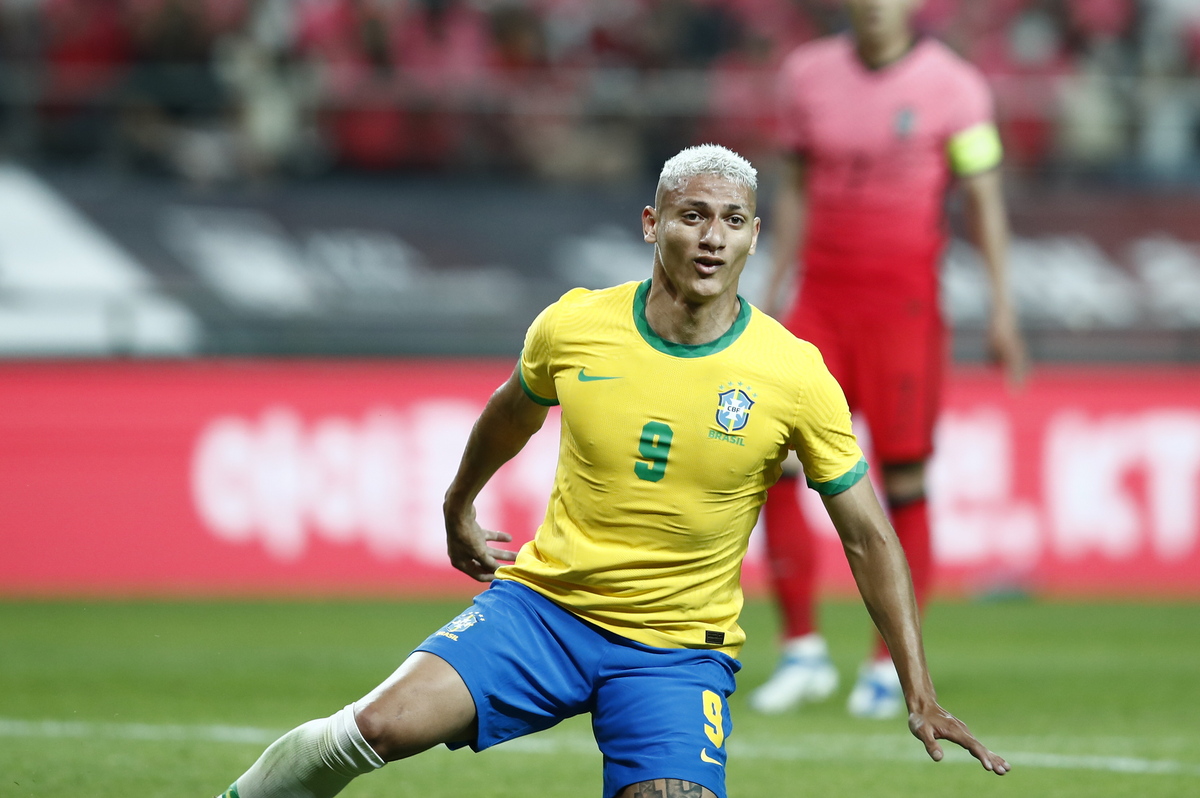 epa09991538 Richarlison of Brazil reacts during the International friendly soccer match between South Korea and Brazil at Sangam World Stadium in Seoul, South Korea, 02 June 2022. EPA/JEON HEON-KYUN