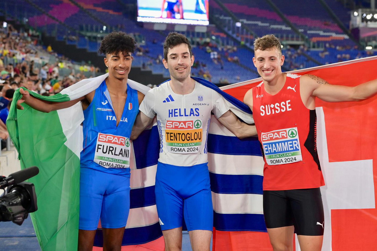 epa11398591 (L-R) Mattia Furlani of Italy, Miltiadis Tentoglou of Greece, and Simon Ehammer of Switzerland after the men's Long Jump Final during the European Athletics Championship, in Rome, Italy, 08 June 2024. EPA/EMILIANO GRILLOTTI