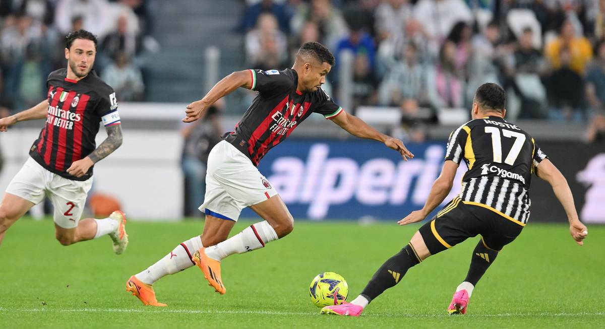 epa10661007 Juventus' Filip Kostic and Milan's Junior Messias in action during the Italian Serie A soccer match between Juventus FC and AC Milan, in Turin, Italy, 28 May 2023. EPA/ALESSANDRO DI MARCO
