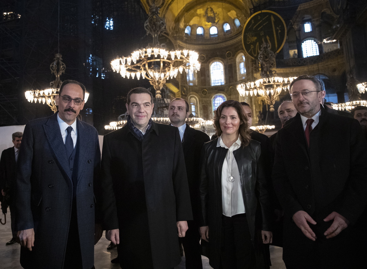 epa07346962 Greek Prime Minister Alexis Tsipras (2-L) speaks to the media as he visits the Hagia Sophia Museum in Istanbul, Turkey, 06 February 2019. Tsipras is in Turkey for a two-day official visit. EPA/TOLGA BOZOGLU