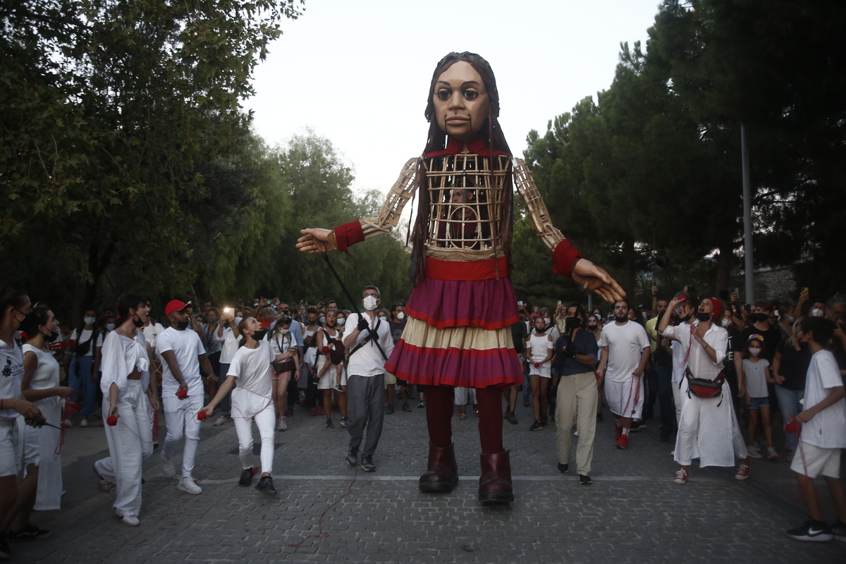 Υπό τους ήχους του τραγουδιού «Άσμα Ασμάτων» του Μίκη Θεοδωράκη και του Ιάκωβου Καμπανέλλη η προσφυγοπούλα Αμάλ από τη Συρία περπάτησε χτες στο κέντρο της Αθήνας με συνοδοιπόρους τους πολλούς μικρούς και μεγάλους. Πλήθος κόσμου, τηρώντας τα μέτρα προστασίας για την Covid-19, συγκεντρώθηκε στην πλατεία Ασωμάτων στο Μοναστηράκι και συνόδευσε την μαριονέτα με ύψος 3,5 μέτρα που διανύει ένα μεγάλο ταξίδι 8.000 χιλιομέτρων με τελικό προορισμό το Μάντσεστερ στην Αγγλία.