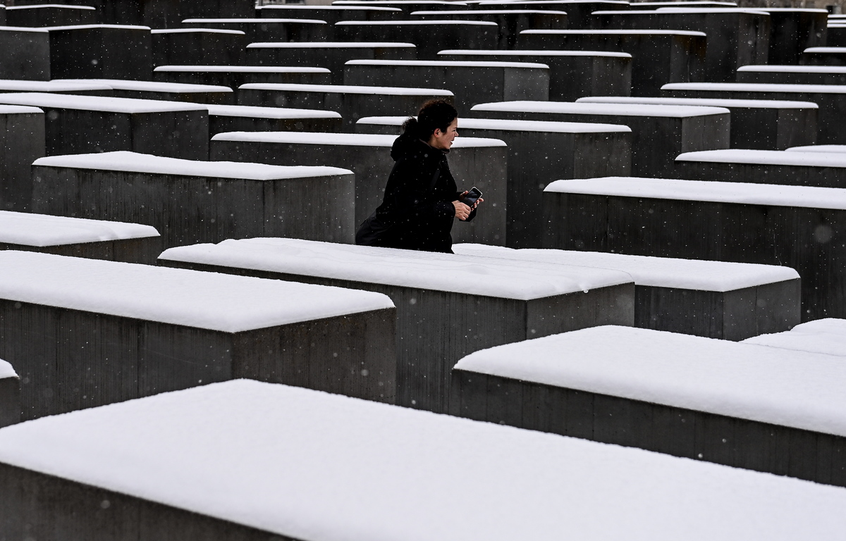 epa08998501 A woman walks among the snow covered Holocaust memorial, the Memorial to the murdered jews of Europe, in Berlin, Germany, 09 February 2021. Winter storm with cold easterly winds brings ice and fresh fallen snow with snow drifts. Many railway services in Germany are disrupted. EPA/FILIP SINGER