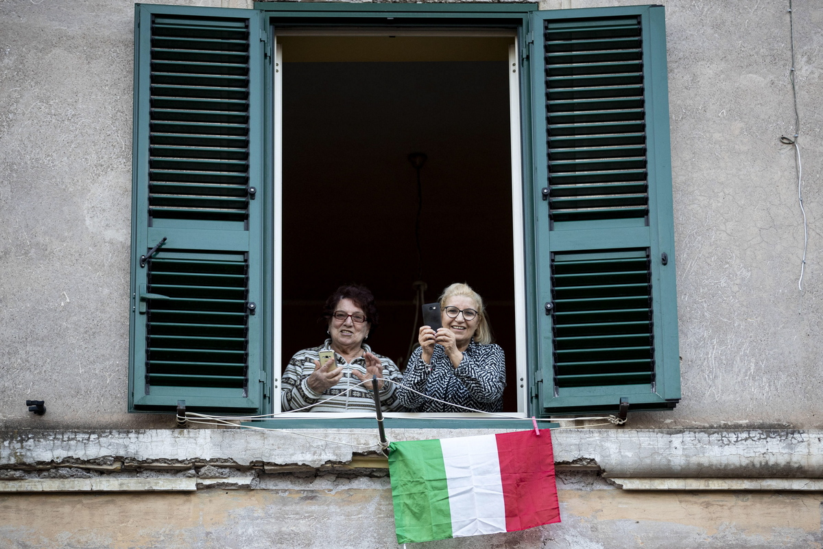 epa08304703 People look out of the windows during a flash mob, in Garbatella district, during the Coronavirus emergency, Rome, Italy, 18 March 2020. EPA/Massimo Percossi