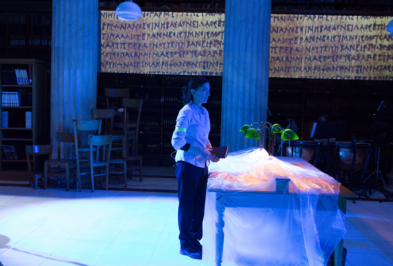 Στην παράσταση, ολόκληρο το κείμενο του Αισχύλου σε νέα μετάφραση του Νίκου Α. Παναγιωτόπουλου παρουσιάζεται σε έναν πυκνό ρυθμό προσωποποιημένης αφήγησης. Οι πρωταγωνιστές Αμαλία Μουτούση και Κωνσταντίνος Αβαρικιώτης, η mezzo-soprano Άννα Παγκάλου και οι σολίστες μουσικοί Κατερίνα Κωνσταντούρου και Χρήστος Λιάτσος, μέσα στον χώρο του αναγνωστηρίου της Εθνικής Bιβλιοθήκης της Ελλάδος -στο ιστορικό Βαλλιάνειο Μέγαρο- διατρέχουν το σύνολο του κειμένου του Προμηθέα Δεσμώτη του Αισχύλου.