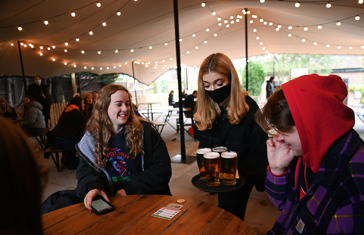 epa09130146 A bar lady delivers pints to a table of young people at the Fox on the Hill pub in South London, Britain, 12 April 2021. Britain has begun its second phase of unlocking after months of lockdown. Pubs, restaurants and shops are reopening from April 12. Pubs are only allowed to serve food and drinks outside. EPA/ANDY RAIN