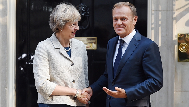 epaselect epa05529861 British Prime Minister Theresa May (L) welcomes President of the European Council Donald Tusk (R) to 10 Downing Street in London, Britain, 08 September 2016. May and Tusk held talks on Britain's exit from the European Union. EPA/ANDY RAIN