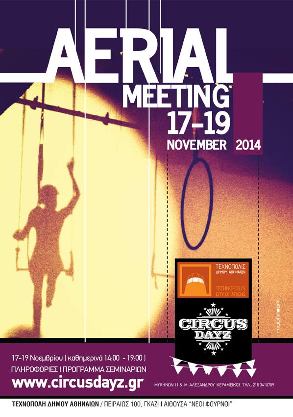 Στην Τεχνόπολη του Δήμου Αθηναίων, διοργανώνεται το 1ο Aerial Meeting, με τη συνεργασία της Circus Dayz. Για πρώτη φορά όσοι ασχολούνται με την εναέρια ακροβασία δίνουν ραντεβού στην Τεχνόπολη για να ανταλλάξουν ιδέες και τεχνικές. Κατά τη διάρκεια του τριήμερου καλλιτέχνες και εκπαιδευτές θα διδάξουν τεχνικές πάνω στη στατική ακροβατική κούνια, τον εναέριο χορό σε ακροβατικά πανιά, τον περιστρεφομενο ακροβατικό κρίκο καθώς και σε όλα τα άλλα αντικείμενα της εναέριας τέχνης. Καλεσμένοι είναι όλοι όσοι λατρεύουν να είναι στο αέρα! Τρίτη 18 και Τετάρτη 19: 12.30 – 7μ.μ. Πειραιώς 100, Γκάζι.