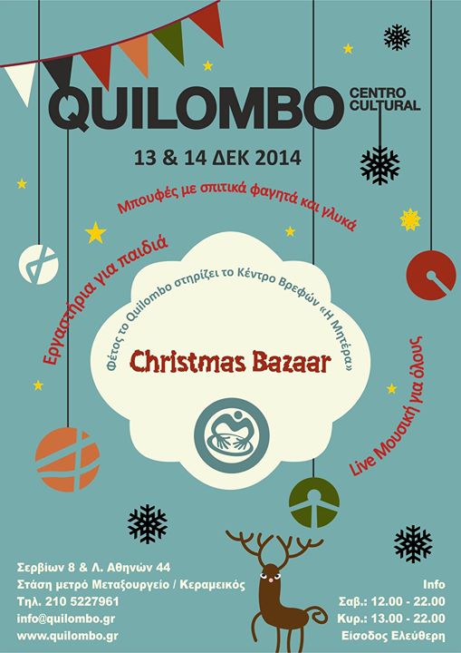 Στο Quilombo Centro Cultural, διοργανώνεται για δεύτερη και τελευταία μέρα το Quilombo Bazaar, με κοσμήματα, αξεσουάρ, είδη σπιτιού, ρούχα, σαπούνια, καλλυντικά και βότανα για τα δώρα σας, γιορτινός μπουφές με σπιτικά φαγητά και γλυκά, ζεστό κρασί gluhwein και εργαστήρια για τα παιδιά. Τα έσοδα του μπουφέ θα διατεθούν στο Κέντρο Βρεφών «Η Μητέρα» ενώ θα συγκεντρώνονται και είδη πρώτης ανάγκης για το Κέντρο (λάδι, σνακς και σοκολάτες για τα παιδιά, είδη ατομικής υγιεινής, απορρυπαντικά, καθώς και δωροεπιταγές για super market). 1-10 μ.μ. Σερβίων 10 & Λεωφ. Αθηνών.