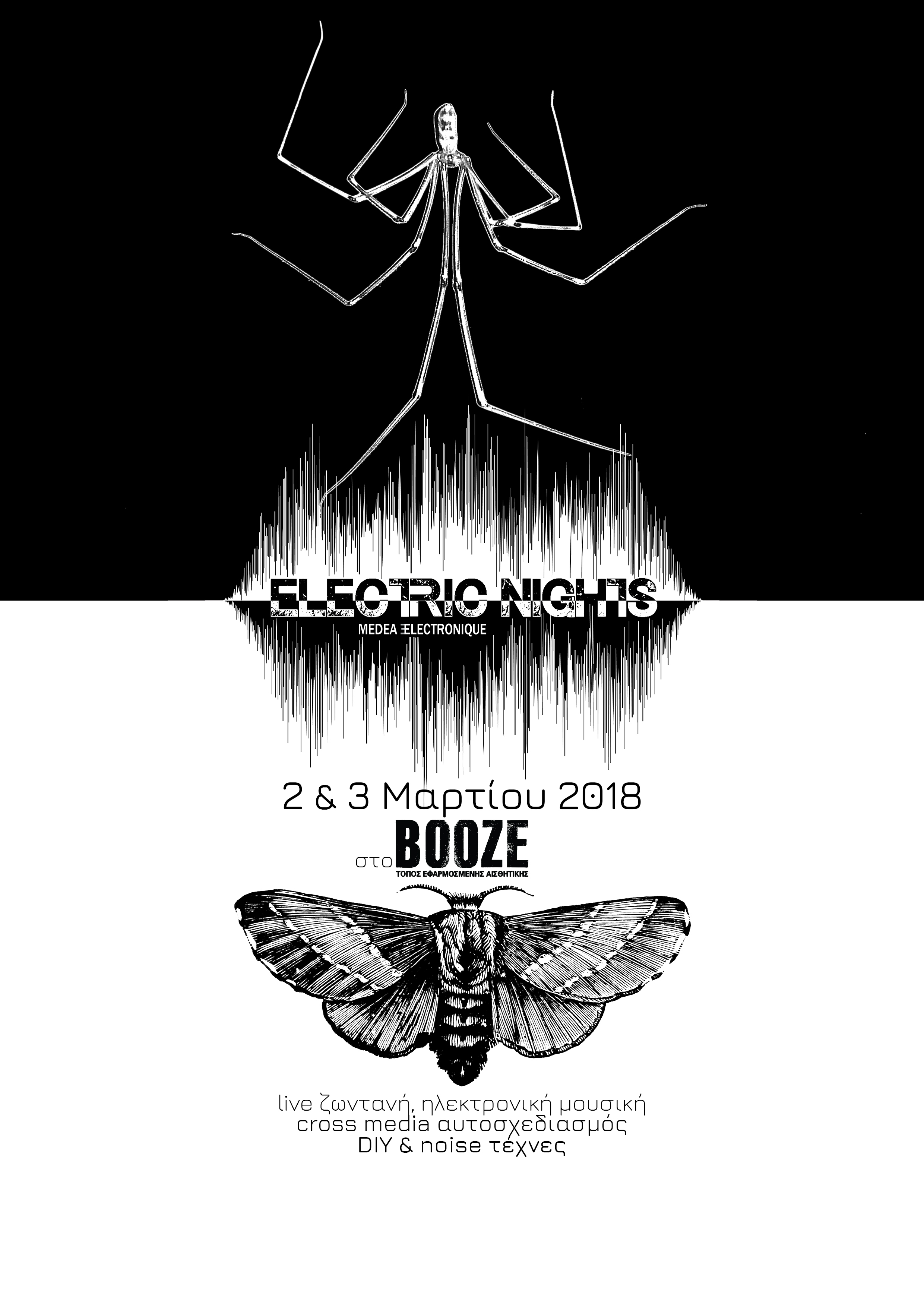 To ELECTRIC NIGHTS, το καινοτόμο φεστιβάλ ζωντανής ηλεκτρονικής μουσικής αφιερωμένο στην τέχνη και την τεχνολογία του ήχου, επιστρέφει για 6η χρονιά στην Αθήνα από την καλλιτεχνική ομάδα MEDEA ELECTRONIQUE. Την Παρασκευή 2 Μαρτίου και το Σάββατο 3 Μαρτίου παρουσιάζονται στη σκηνή του BOOZE οι νέες δυναμικές παρουσίες και οι πειραματισμοί της ηλεκτρονικής σκηνής από την Ελλάδα και το εξωτερικό.