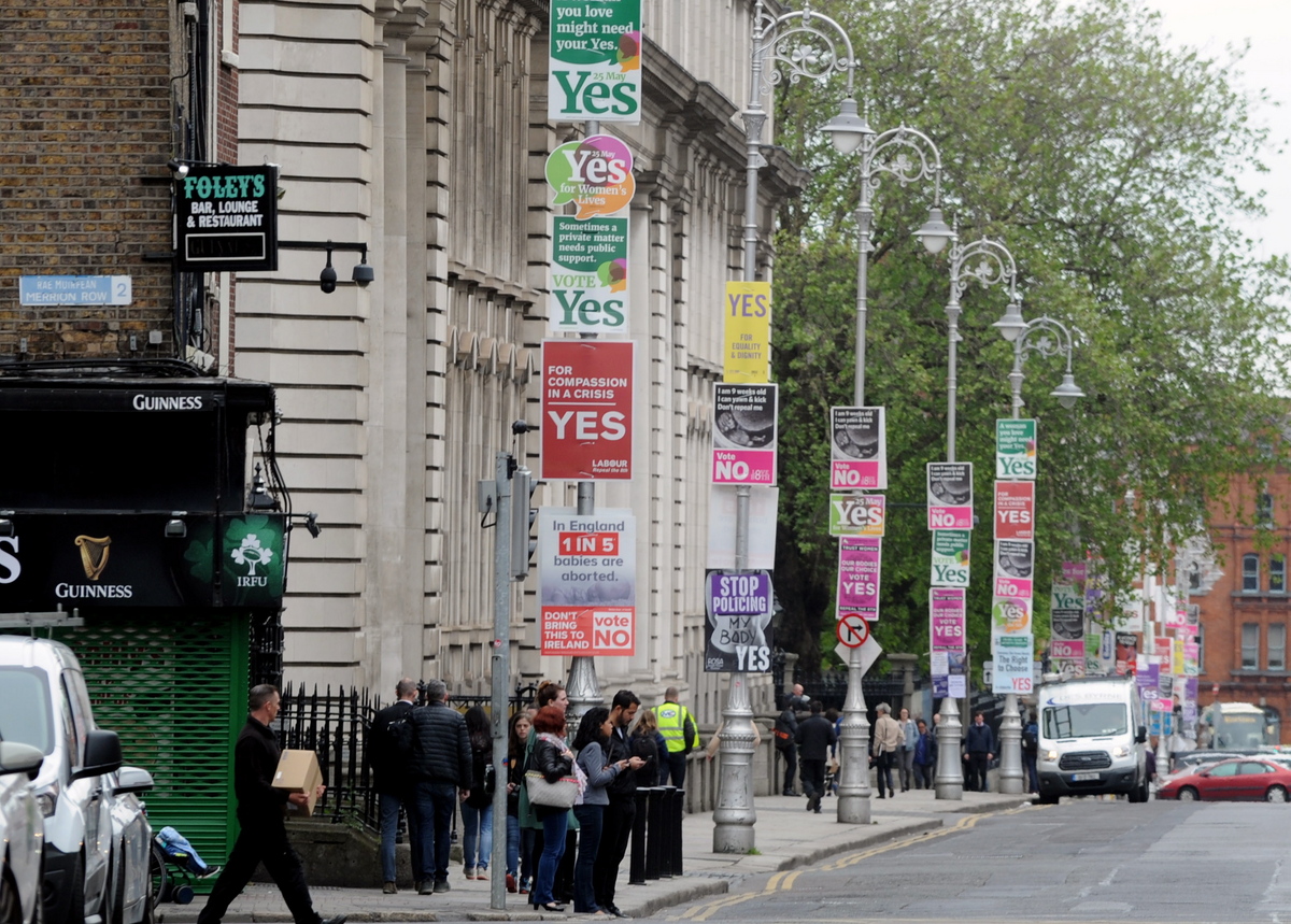 epa06755682 Campaign posters in the forthcoming abortion referendum in Dublin City, Ireland, 22 May 2018. On Friday 25 May the country will hold a referendum over an legislation of abortion in Ireland. EPA/AIDAN CRAWLEY