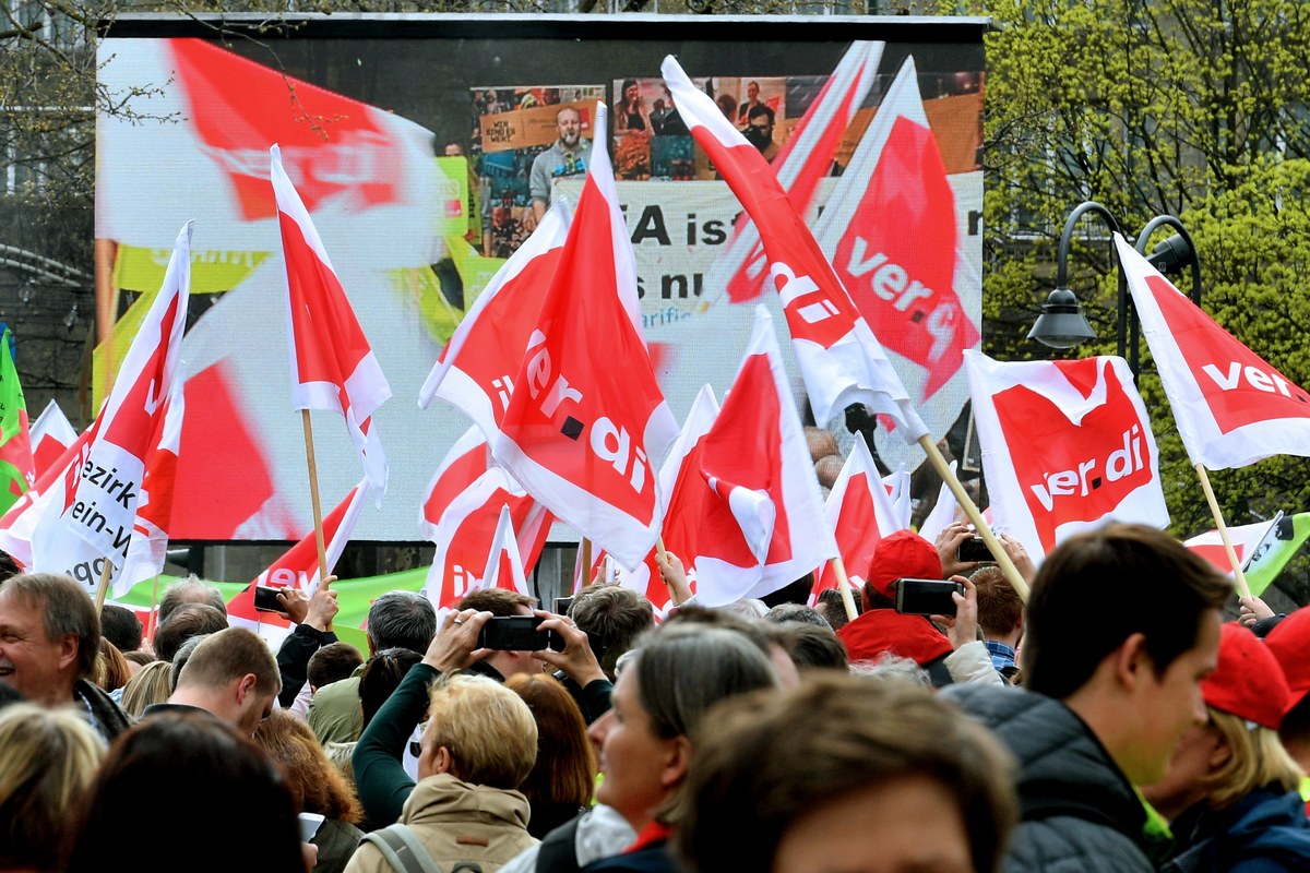 epa06658726 Workers of public service gather during a public service strike in Cologne, Germany, 20 March 2018. The German public services union Ver.di has announced rolling strikes across the country over the coming days as it ramps up pressure for a six percent pay rise. Strikes are to hit public transport, rubbish collection, kindergartens and hospitals. EPA/SASCHA STEINBACH