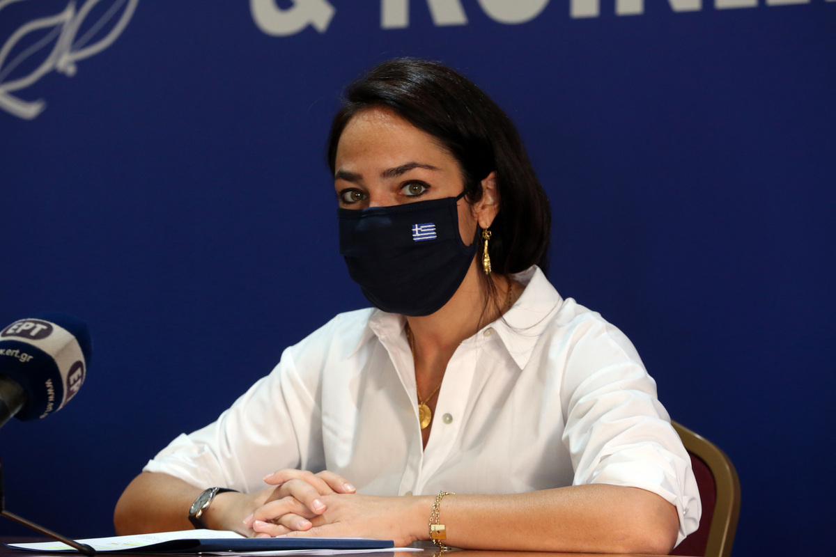 Η υφυπουργός Εργασίας Δόμνα Μιχαηλίδου μιλά κατά τη διάρκεια συνέντευξης σχετικά με την ανακοίνωση της επέκτασης του προγράμματος voucher για τους παδικούς σταθμούς, Αθήνα, Πέμπτη 15 Οκτωβρίου 2020. ΑΠΕ-ΜΠΕ/ΑΠΕ-ΜΠΕ/ΑΛΕΞΑΝΔΡΟΣ ΜΠΕΛΤΕΣ
