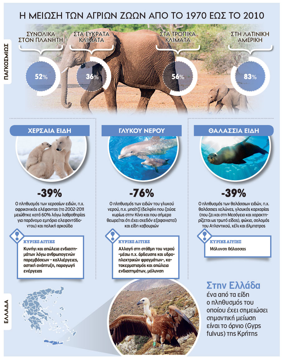 Άρθρο στο Έθνος αναφέρει πως τα τελευταία 40 χρόνια ο πληθυσμός των άγριων ζώων μειώθηκε κατά 52%. Όλο και περισσότερα ζώα όπως ψάρια, πτηνά, θηλαστικά, αμφίβια και ερπετά είναι υπό εξαφάνιση. Η μεγαλύτερη μείωση καταγράφεται στα είδη του γλυκού νερού, τα οποία κατά τη χρονική περίοδο 1970-2010 γνώρισαν πληθυσμιακή μείωση της τάξεως του 76%, ενώ γεωγραφικά η σοβαρότερη μείωση σημειώνεται στη Βραζιλία με ποσοστό 83%. Η Ελλάδα δεν μένει αλώβητη, με είδη όπως το όρνιο της Κρήτης να αποδεκατίζονται στο πέρασμα των χρόνων. Τα παραπάνω στοιχεία προκύπτουν από την έκθεση Ζωντανός Πλανήτης 2014 που έδωσε χθες στη δημοσιότητα η WWF και η οποία καταδεικνύει την κατασπατάληση των φυσικών πόρων της Γης. Η έκθεση εξέτασε 10.380 πληθυσμούς συνολικά περίπου 3.000 ειδών και κρούει τον κώδωνα του κινδύνου.