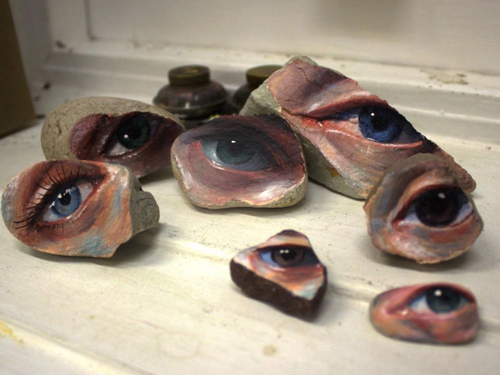 Οι πέτρες-μάτια της Τζένιφερ Όλνατ κάνουν μεγάλη «σταδιοδρομία» στο Διαδίκτυο. Και όταν η καλλιτέχνις από τη Μελβούρνη δεν ζωγραφίζει τις πέτρες της, φιλοτεχνεί σουρεαλιστικά πορτρέτα όπου εξερευνά το αλλόκοτο, το ασυνείδητο, τη μεταμόρφωση και την ταυτότητα.