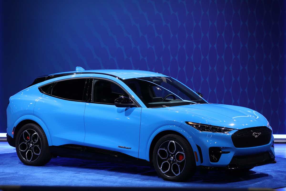 epa09590177 A Ford Mustang. Mach-E is displayed at AutoMobilty LA in Los Angeles, California, USA, 18 November 2021. AutoMobility LA is being held on 17 and 18 November. EPA/DAVID SWANSON
