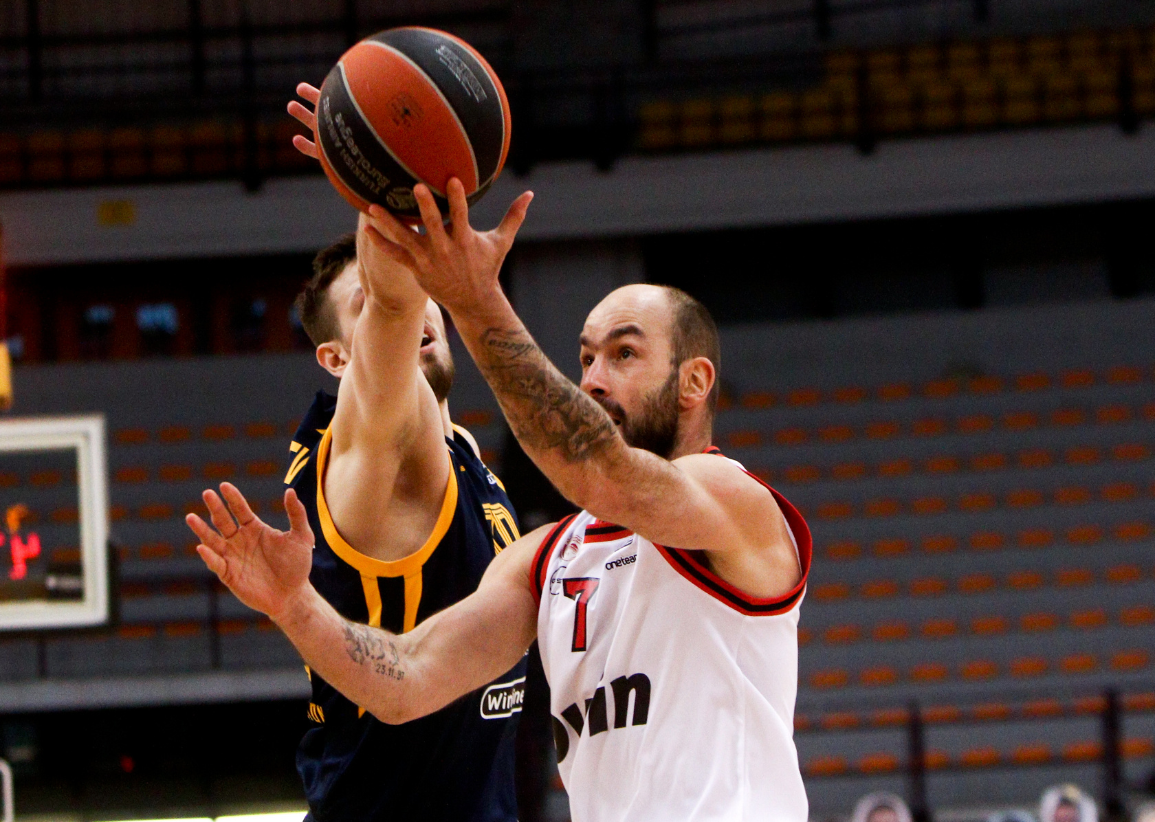 Ο παίκτης του Ολυμπιακού Βασίλης Σπανούλης (Δ) κατά τη διάρκεια του αγώνα Ολυμπιακός - Κίμκι για την 34η αγωνιστική της Euroleague, στο ΣΕΦ στον Πειραιά, την Παρασκευή 9 Απριλίου 2021. ΑΠΕ-ΜΠΕ/ΑΠΕ-ΜΠΕ/ΓΕΩΡΓΙΑ ΠΑΝΑΓΟΠΟΥΛΟΥ