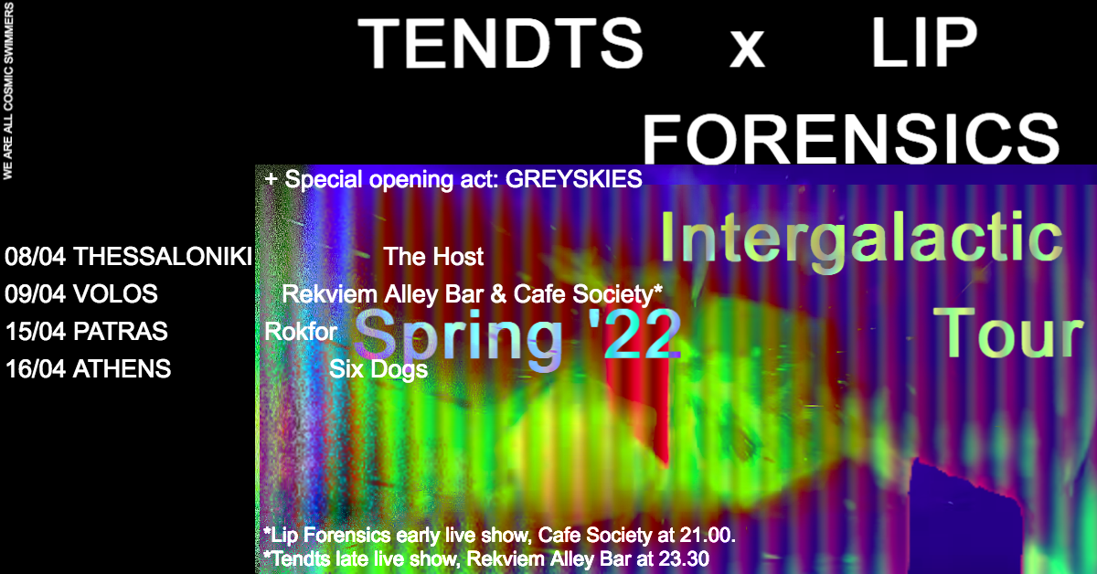 Tendts, Lip Forensics και Grey Skies φορτώνουν στις αποσκευές τους σύνθια, κιθάρες, drum machines και ξεκινούν για μια σειρά intergalactic εμφανίσεων σε Θεσσαλονίκη, Βόλο, Πάτρα, Αθήνα.