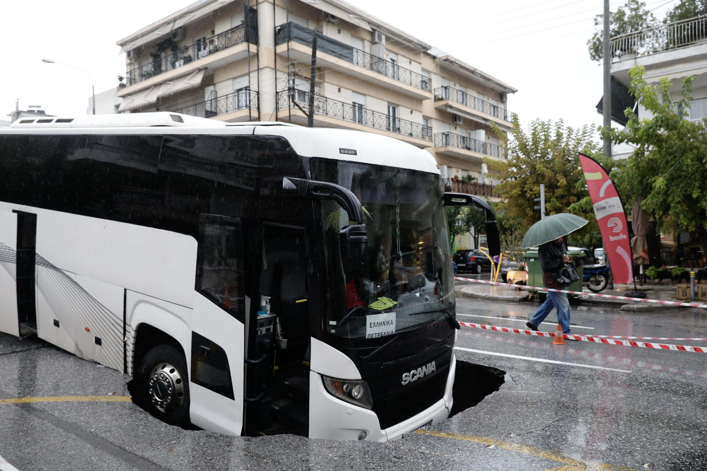 Βύθιση λεωφορείου έπειτα από υποχώρηση του οδοστρώματος στην οδό Εθνικής Αντιστάσεως στην Καλαμαριά Θεσσαλονίκης, 15 Οκτωβρίου 2021.
