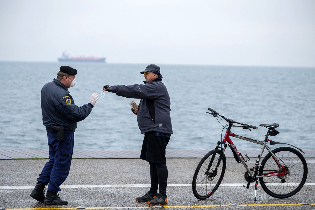 Αστυνομικοί πραγματοποιούν ελέγχους σε περαστικούς στην παραλία της Θεσσαλονίκης, μετά την εφαρμογή των πρόσθετων αυστηρών μέτρων με απαγόρευση κυκλοφορίας των πολιτών, για τον περιορισμό της διάδοσης του κορονοϊού, Τρίτη 24 Μαρτίου 2020 ΑΠΕ-ΜΠΕ/ΑΠΕ-ΜΠΕ/ΝΙΚΟΣ ΑΡΒΑΝΙΤΙΔΗΣ