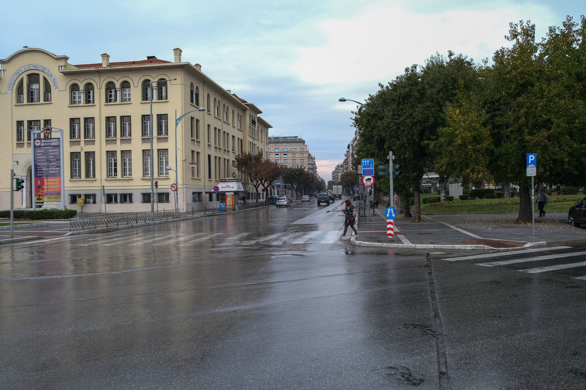 Ελάχιστη η κίνηση στους δρόμους της Θεσσαλονίκης μετά από το καθολικό lockdown που άρχισε να ισχύει από τα τις 6 το πρωί και για τις επόμενες 14 ημέρες, λόγω της εκρηκτικής άυξησης των κρουσμάτων του Covid19, Τρίτη 3 Νοεμβρίου 2020.