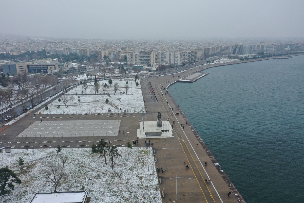 Λήψη με drone εικονίζει την χιονόπτωση στην παραλία της Θεσσαλονίκης, Κυριακή 14 Φεβρουαρίου 2021. Σε εξέλιξη βρίσκεται η κακοκαιρία στη Βόρεια Ελλάδα, με το χιόνι και το τσουχτερό κρύο που έφερε η «Μήδεια» από το πρωί του Σαββάτου. ΑΠΕ-ΜΠΕ/ΑΠΕ-ΜΠΕ/ΝΙΚΟΣ ΑΡΒΑΝΙΤΙΔΗΣ