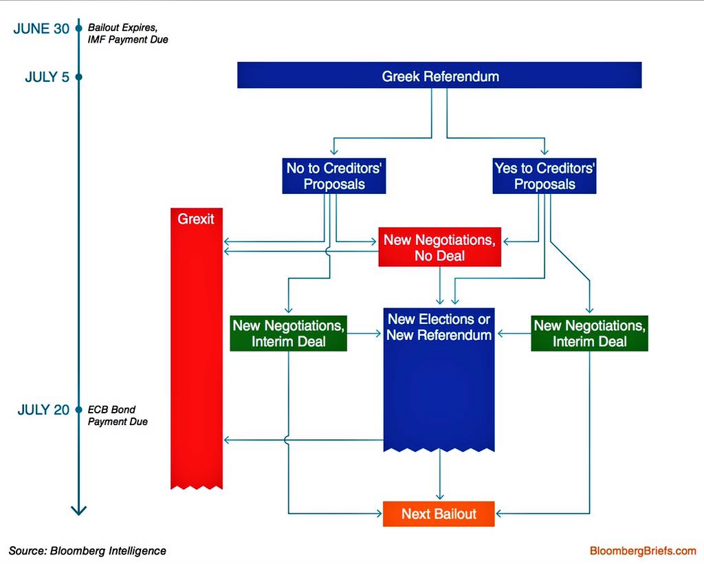 Από το bloombergbriefs.com, το παραπάνω γράφημα περιγράφει τα πιθανά σενάρια των επόμενων ημερών εκκινώντας από την έκβαση του δημοψηφίσματος.