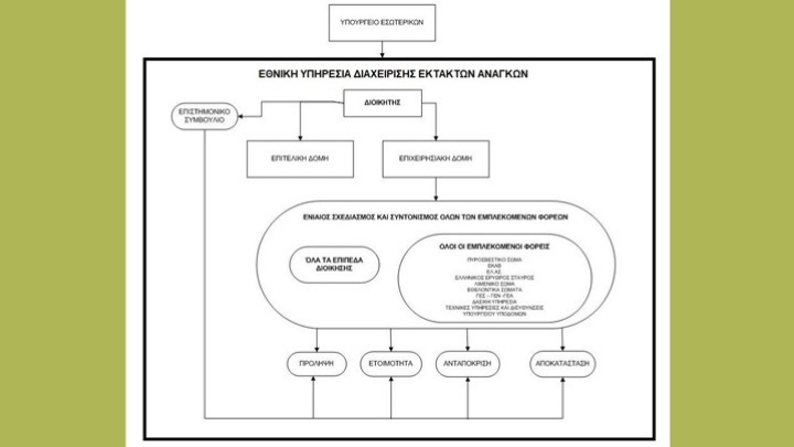 διαχείρισης ανθρώπινων πόρων, μέσων, υλικών και εφοδίων για την αντιμετώπιση έκτακτων αναγκών σε τοπικό, περιφερειακό και εθνικό επίπεδο.