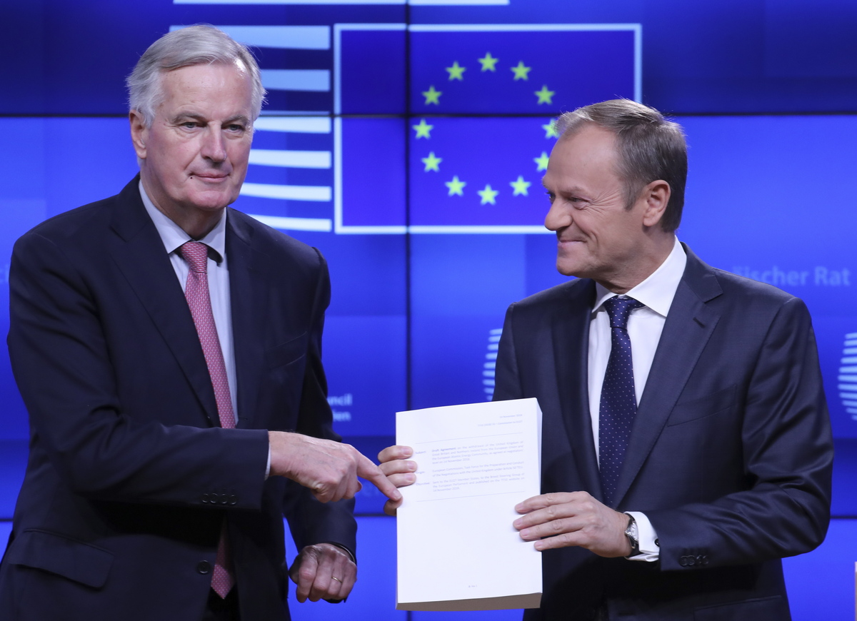 epaselect epa07166449 Michel Barnier (L), the European Chief Negotiator for the United Kingdom Exiting the European Union, presents a draft Brexit withdrawal agreement to European Union Council President Donald Tusk (R) in Brussels, Belgium, 15 November 2018. The British cabinet has backed the draft Brexit withdrawal agreement. EPA/OLIVIER HOSLET