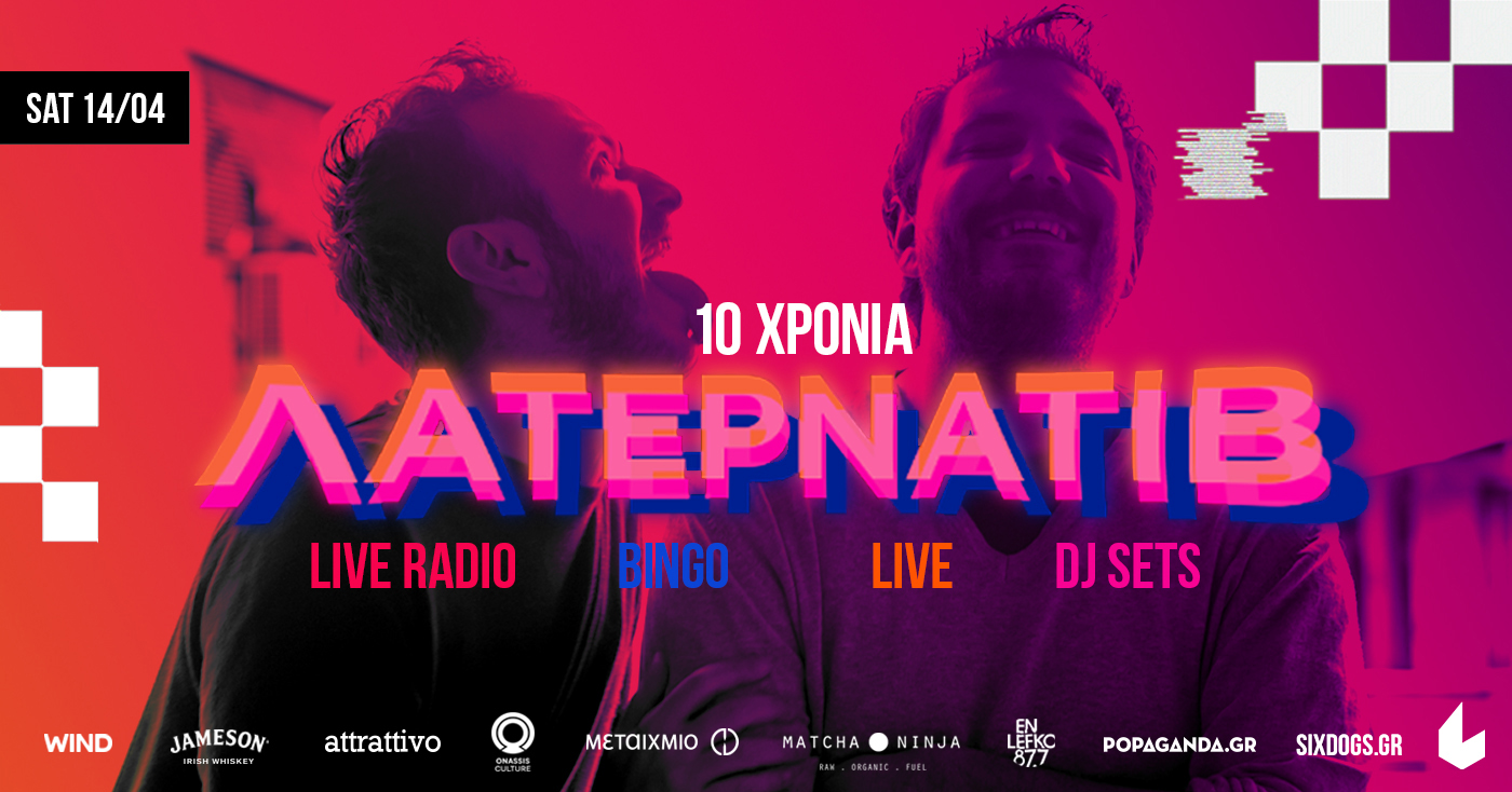 Από τις 16.00 έως την άλλη μέρα τα ξημερώματα το Λατέρνατιβ θα βρίσκεται στο six d.o.g.s για να γιορτάσει τα δέκα του χρόνια. Για λίγες, 15 ωρίτσες, θα αφήσει τη ζεστή φωλιά του πρωινού του Enlefko 87.7 και θα βρεθεί στο στενό της Αβραμιώτου για ένα οργασμό εκδηλώσεων. Να πέσει το βίντεο και ακουλουιεί το πρόγραμμα.