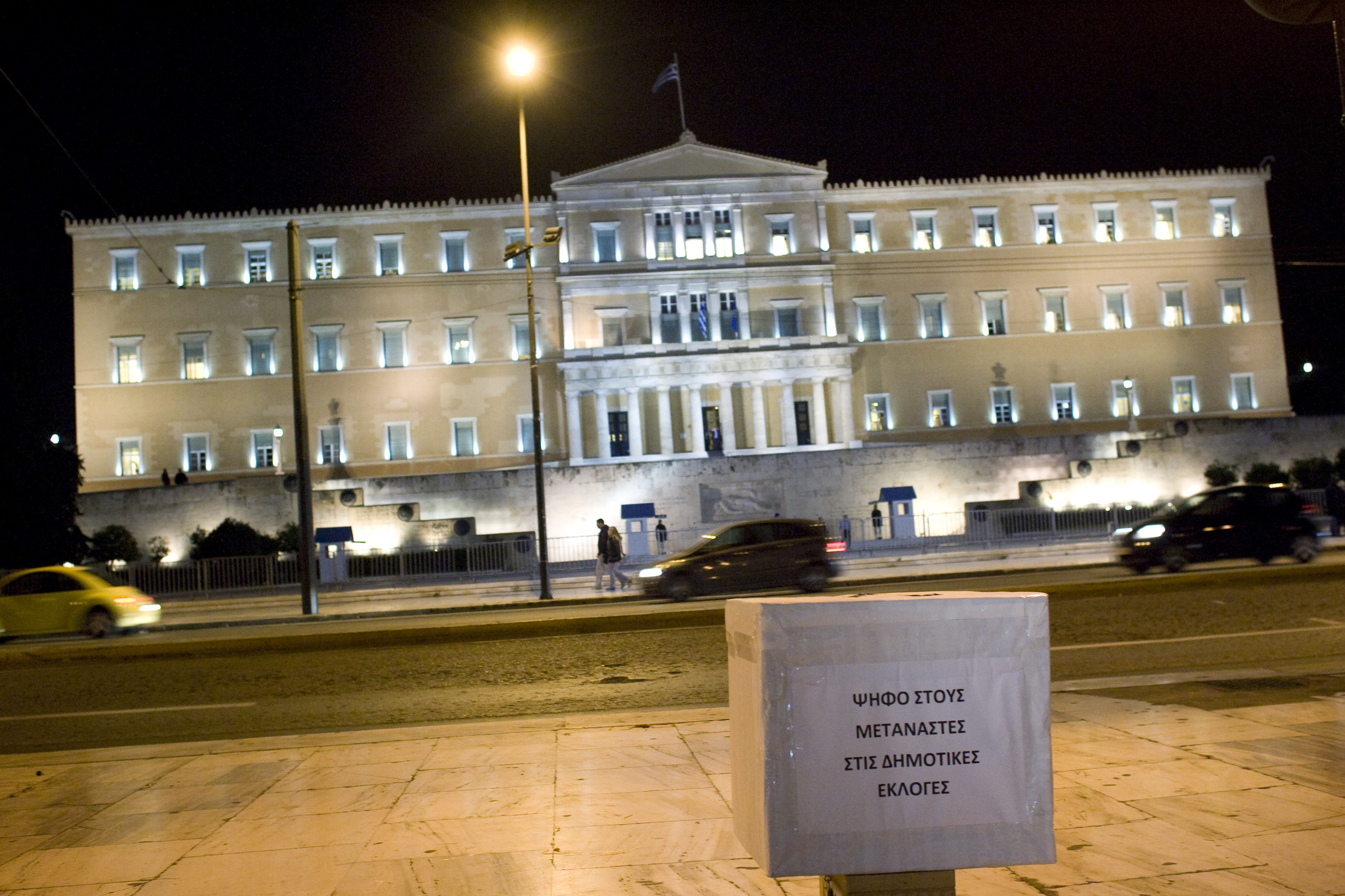 Συγκέντρωση από σύλλογοι μεταναστών και αντιρατσιστικές κινήσεις ενάντια στον αποκλεισμό των μεταναστών και των ομογενών που διαμένουν νόμιμα στη χώρα από τη συμμετοχή στις δημοτικές εκλογές του 2014, έξω από τη Βουλή, λίγο πριν την προσωρινή απόσυρση της διάταξης. Φωτ: Αγγελική Παναγιώτου