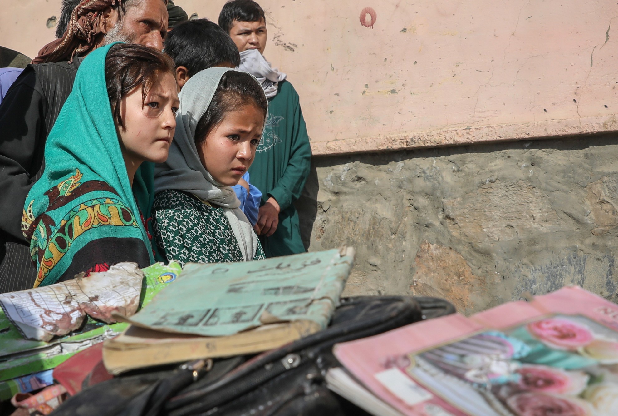 epa09186762 Afghan children keeps watch the belongings of the victims as the bloodstained books and notebooks of students are seen on the ground at the scene of a bomb explosion that targeted a school in the west of Kabul, Afghanistan, 09 May 2021. An explosion near a school in Dasht-e-Barchi area west of Kabul killed at least 50 people and left over 100 injured, according to the Ministry of Interior. EPA/HEDAYATULLAH AMID