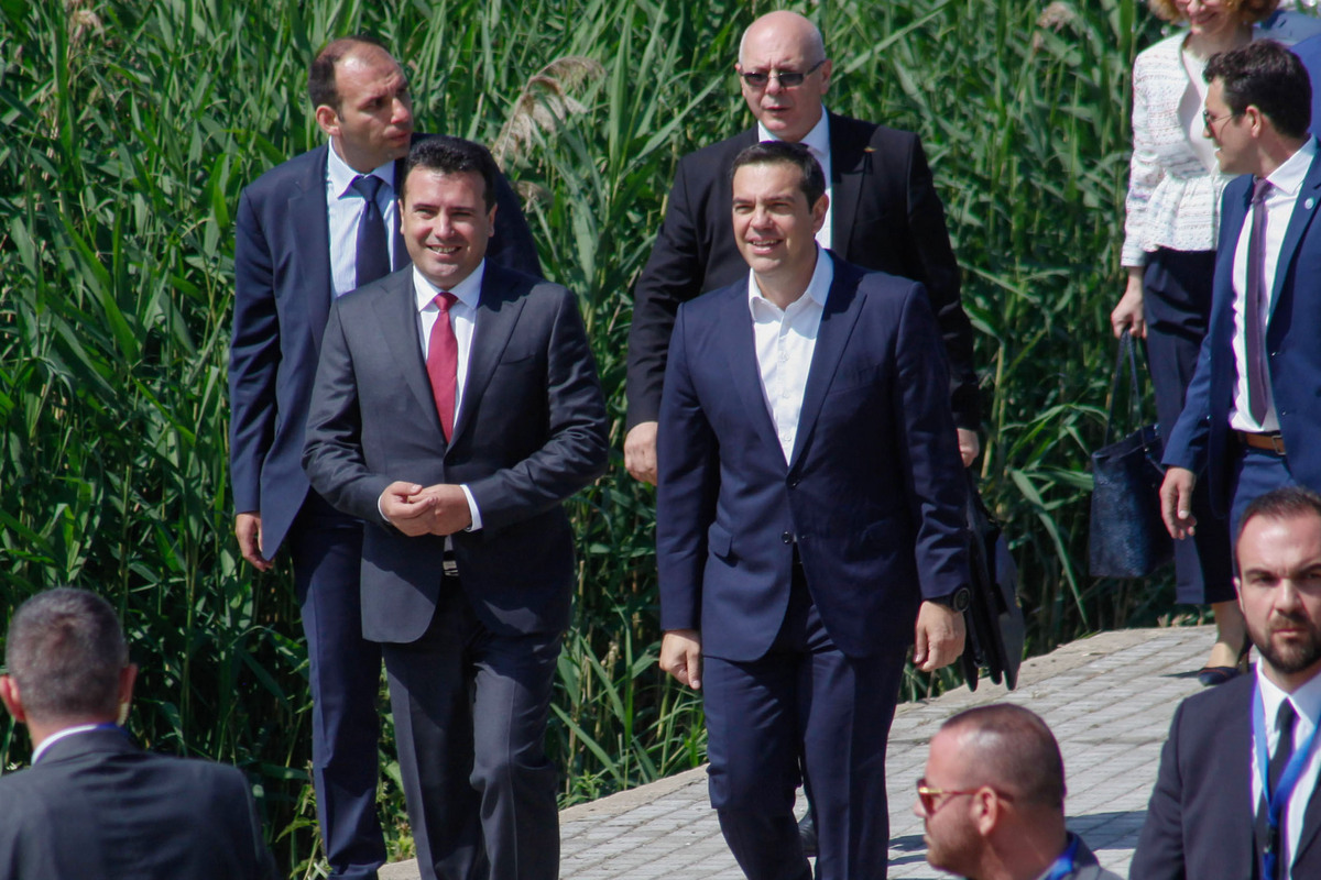 ο πρωθυπουργός της ΠΓΔΜ, Ζόραν Ζάεφ (2Α) και ο πρωθυπουργός της Ελλάδος, Αλέξης Τσίπρας (Κ) καταφτάνουν στους Ψαράδες Πρεσπών για την τελετή υπογραφής συμφωνίας μεταξύ Ελλάδος και ΠΓΔΜ για το ονοματολογικό της ΠΓΔΜ, Φλώρινα, Κυριακή 17 Ιουνίου 2018. Η συμφωνία αποτελεί προϊόν μίας πολύμηνης διαπραγμάτευσης μεταξύ των δύο χωρών και κατέληξε στο όνομα “Βόρεια Μακεδονία” ή “Severna Makedonja”. ΑΠΕ-ΜΠΕ/ ΑΠΕ-ΜΠΕ/ ΝΙΚΟΣ ΑΡΒΑΝΙΤΙΔΗΣ