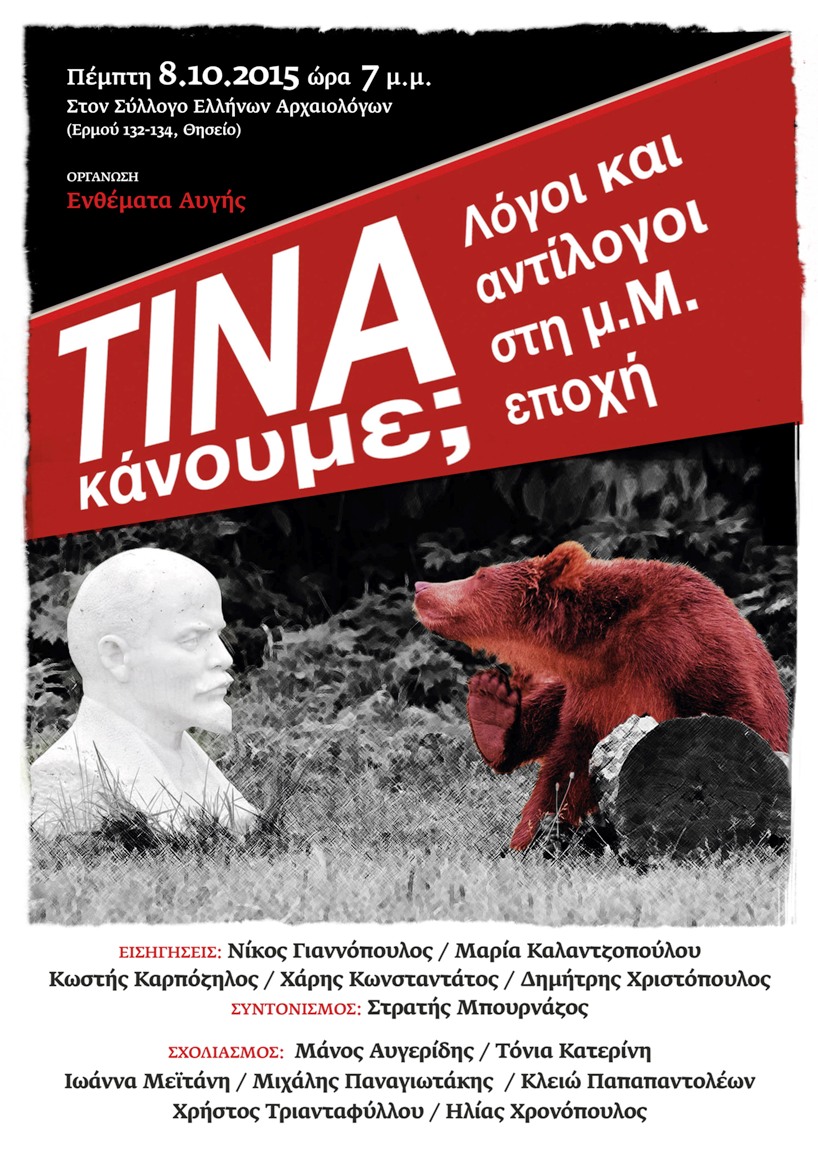 Τα «Ενθέματα» οργανώνουν συζήτηση την Πέμπτη 8 Οκτωβρίου, ώρα 19.00, με θέμα «ΤΙΝΑ κάνουμε — λόγοι και αντίλογοι στη μ.Μ. εποχή», στον Σύλλογο Ελλήνων Αρχαιολόγων (Ερμού 132-134, Θησείο). Θέλουμε να ανοίξουμε την κουβέντα, εστιάζουμε κριτικά την επτάμηνη διακυβέρνηση του ΣΥΡΙΖΑ και συζητώντας τις προοπτικές που ανοίγονται. Θέλοντας να αποφύγουμε τους παράλληλους μονόλογους, θα δοκιμάσουμε μια νέα μορφή εκδήλωσης: