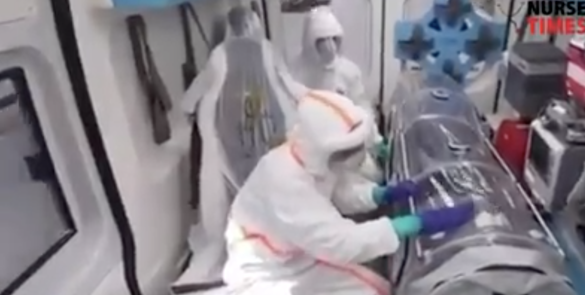 Νοσοκόμα των πρώτων βοηθειών συνοδεύει ασθενή που πιθανώς πάσχει από κοροναϊό και προσπαθεί να του δώσει κουράγιο.