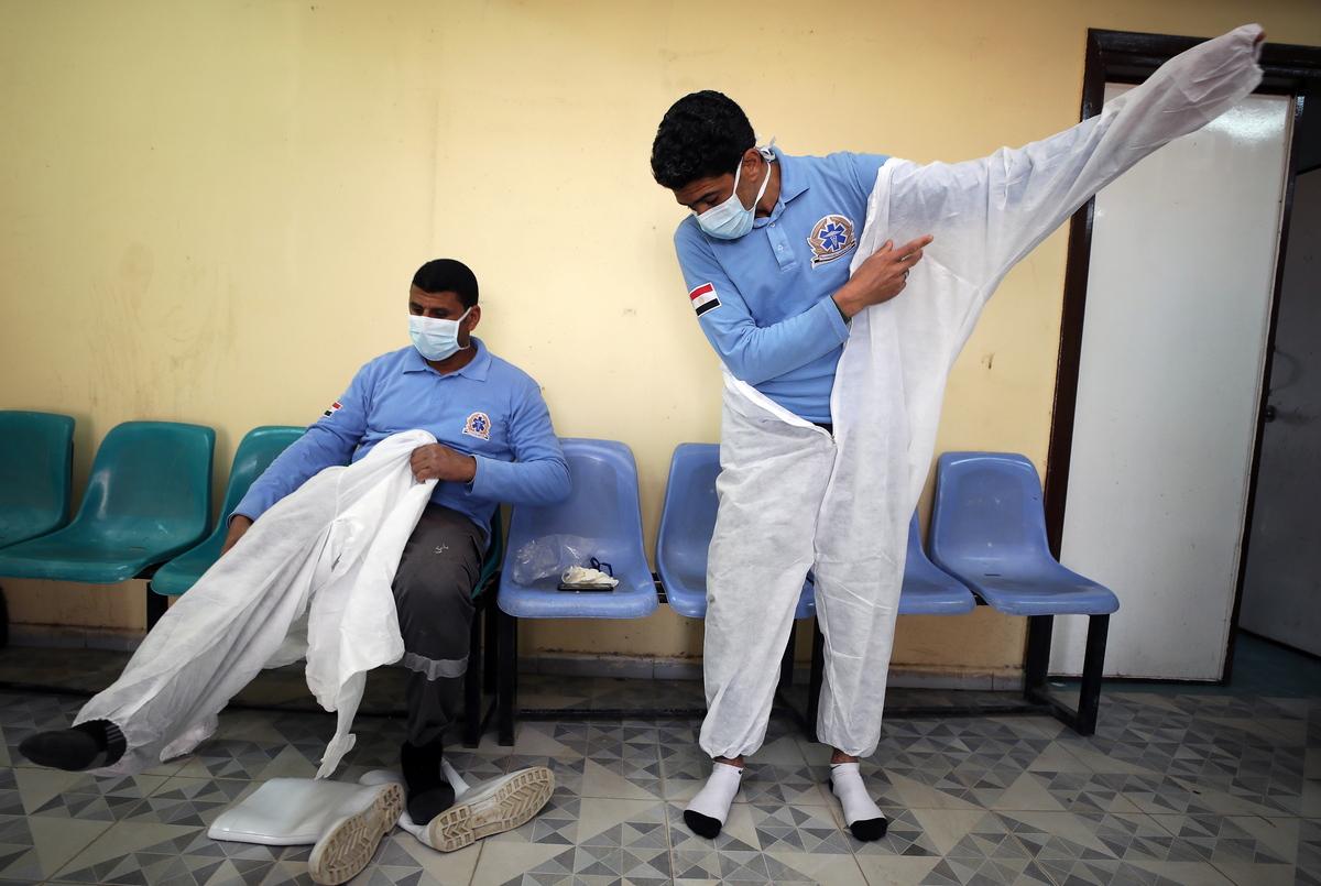 epa08362920 Health workers put on protective suits at the medical ambulance centre in Giza, Egypt, 14 April 2020. Egyptian authorities extended a two-week-long curfew, starting on 09 April during which all public transportation in Cairo is suspended due to the ongoing pandemic of the COVID-19 disease caused by the SARS-CoV-2 coronavirus. EPA/KHALED ELFIQI