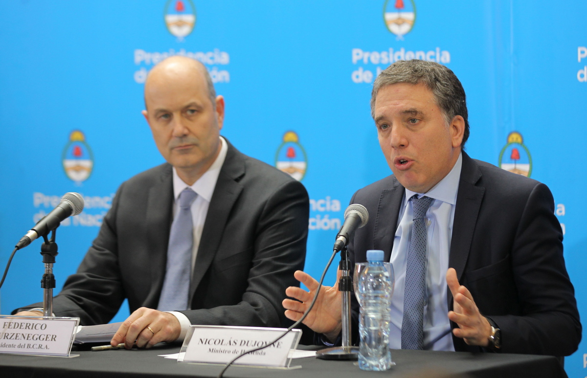 epa06792296 The President of the Central Bank of the Argentine Republic (BCRA), Federico Sturzenegger (L), and the Argentine Finance Minister Nicolas Dujovne (R), deliver a press conference in Buenos Aires, Argentina, 07 June 2018. Argentina announced the signing of a three-year stand-by agreement with the International Monetary Fund (IMF) for 50 billion US dollar, to lower inflation, achieve fiscal balance and avoid a fiscal crisis. EPA/JAVIER CAAMANO