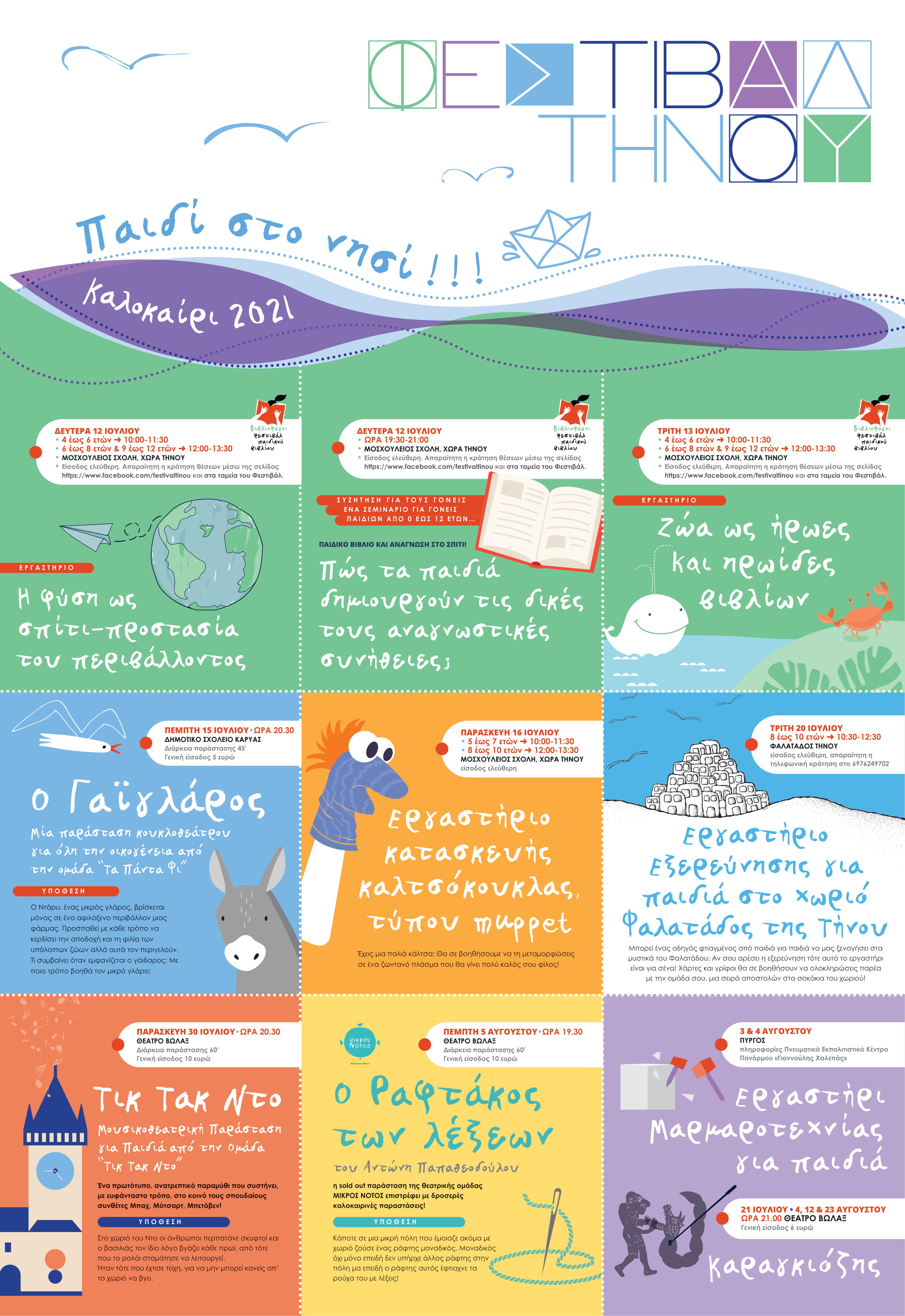 Φέτος, εγκαινιάζει το πρόγραμμα Παιδί στο νησί με εργαστήρια/ κατασκευές/ φεστιβάλ παιδικού βιβλίου/ θέατρο για παιδιά/ κουκλοθέατρο/εργαστήριο εξερεύνησης και τον αγαπημένο σε όλους Καραγκιόζη.