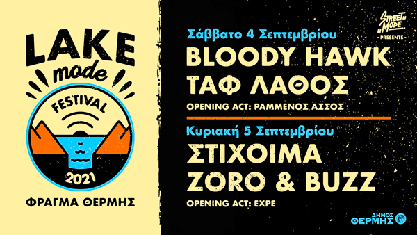 Πιο συγκεκριμένα, στην σκηνή του 1ου Lake Mode Festival θα ανέβουν το Σάββατο 4 Σεπτεμβρίου ο Bloody Hawk και ο Ταφ Λάθος, ενώ την Κυριακή 5 Σεπτεμβρίου οι Στίχοιμα και οι Zoro & Buzz. Τις συναυλίες θα ανοίξουν ο Ραμμένος Άσσος στις 4/9 και η Expe στις 5/9, ενώ το φεστιβάλ θα πλαισιώσουν παράλληλες δράσεις και πολλά give-aways! Ακολουθείστε το Lake Mode Festival σε Instagram και Facebook για όλες τις ανακοινώσεις και τους διαγωνισμούς.