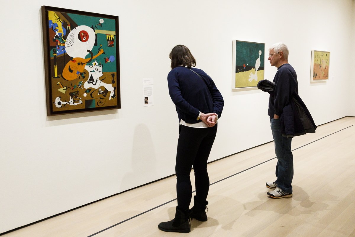 epa07383673 People look at artworks by Spanish artist Joan Miro assembled for the exhibit 'Joan Miro: Birth of the World' during a preview at the Museum of Modern Art in New York, New York, USA, 20 February 2019. The exhibit runs from 24 February until 15 June 2019 and features 60 works by Miro from the MoMA's collection and works on loan to the museum. EPA/JUSTIN LANE