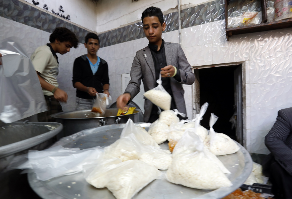 epa08361214 Volunteers provide free food rations to Yemenis at a charity group in Sanaa, Yemen, 13 April 2020. According to reports, the World Food Programme is set to halve food aid to Houthi-controlled areas of Yemen from mid-April due to a funding crisis after some international donors stopped their aid over concerns the Houthis are hindering aid deliveries as more than two-thirds of Yemen’s 27 million population are food insecure. WFP feeds more than 12 million people in war-ridden Yemen a month. EPA/YAHYA ARHAB