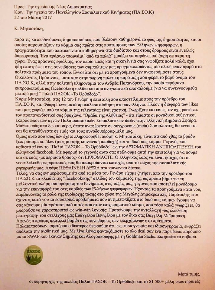 Στο παρελθόν οι διαχειριστές της σελίδας είχαν στείλει επιστολή στο ΠΑΣΟΚ (το γνωστό, το κοινοβουλευτικό) ενώ επόμενο στόχος είναι να ξεπεράσουν τα likes του ΣΥΡΙΖΑ. Θα τα καταφέρουν;
